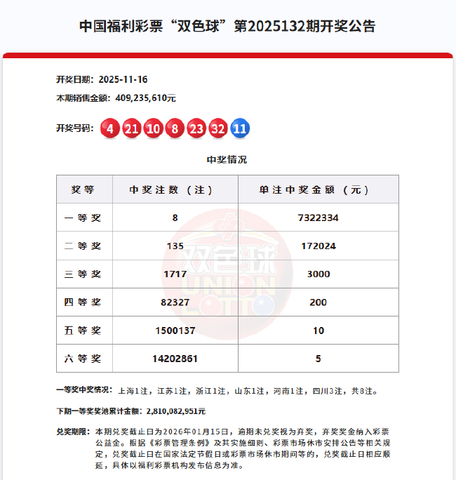 北京时间2025年11月16日,单注奖金732万余元,落地单注奖金17万余元。江苏1注,二等奖开出135注,福彩双色球第25132期开奖,本期双色球全国销量为4.09亿余元,奇偶比为2:4。蓝球11。8注头奖分落6地,形态方面,计奖结束后奖池余额为28.1亿余元。